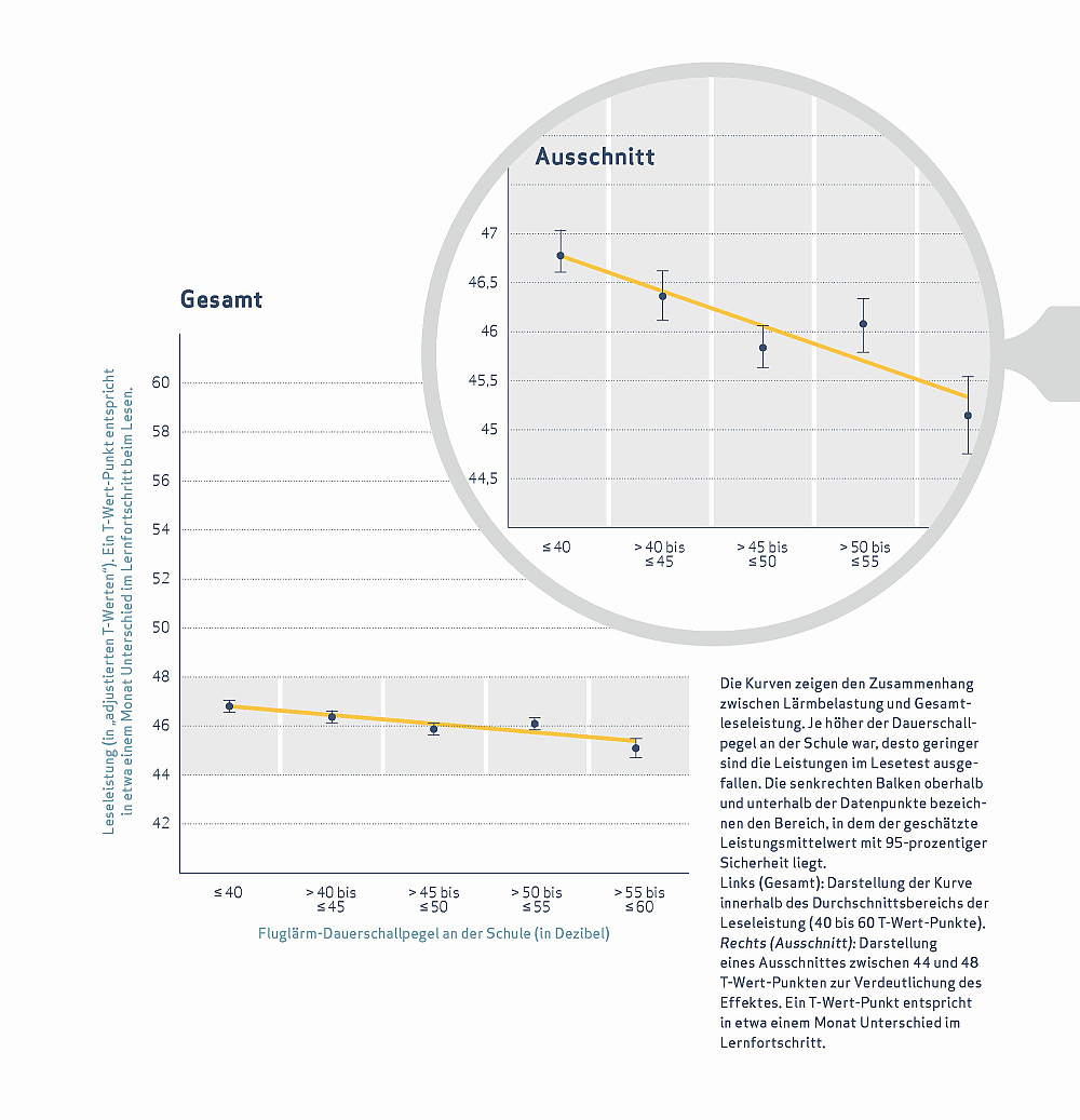 Fluglärm wirkt sich auf die Leseleistungen von Kindern aus, die sich in der Phase des Lesenlernens befinden. Der Zusammenhang ist linear: Je stärker die Belastung, desto stärker ist die Entwicklung beeinträchtigt. Bei den untersuchten Zweitklässlern verzögerte eine Zunahme des Dauerschallpegels um 10 Dezibel (A) das Lesenlernen um einen Monat.