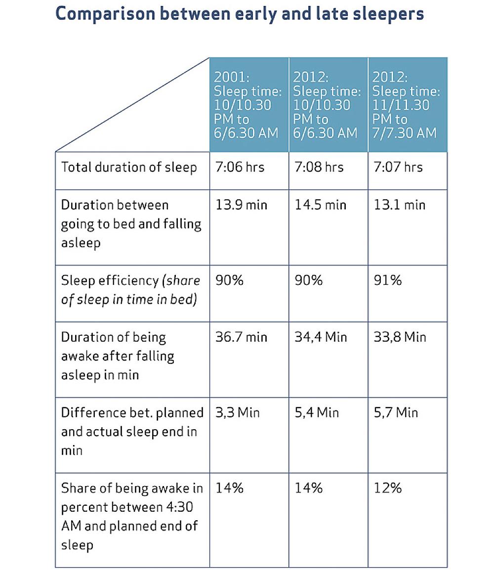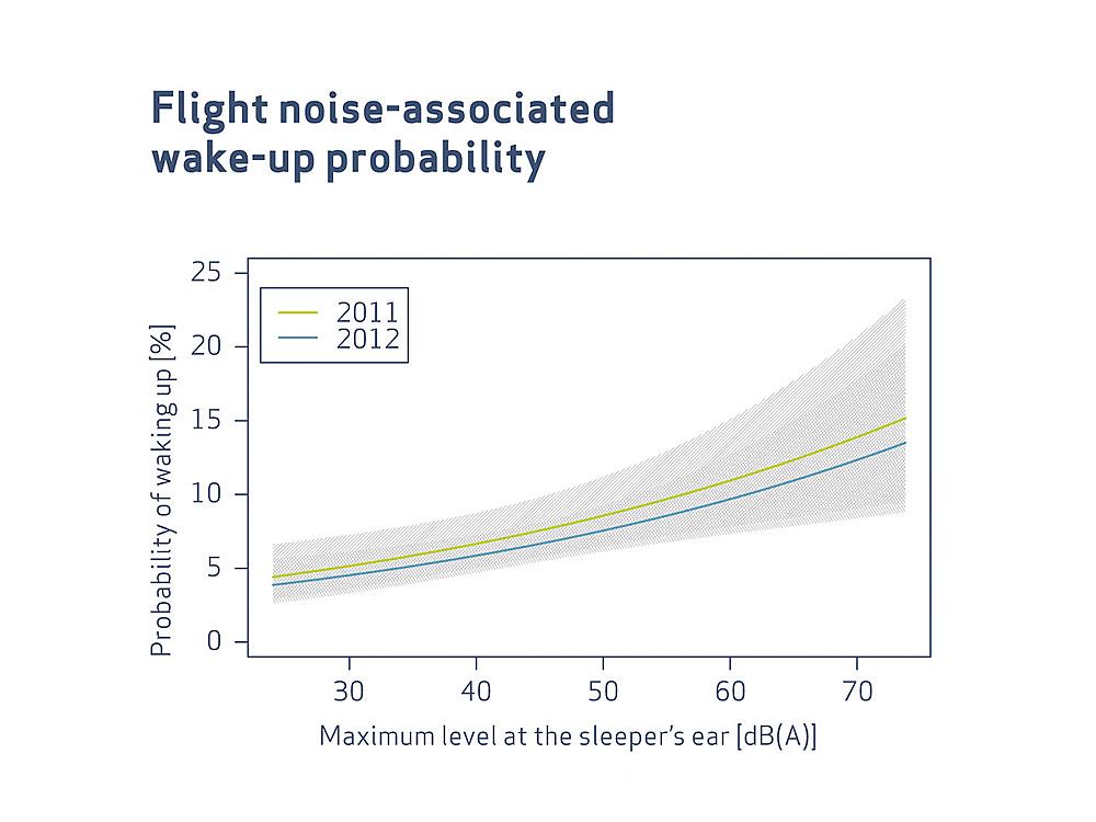 The prohibition of planned starts and landings between 11 p.m. and 5 a.m. achieved an important goal: the residents at the Frankfurt airport woke up less often in 2012 than in the prior year, due to the smaller number of night flights. The probability of waking up at a night flight did not differ in the years of 2011 and 2012, however. In 2012, such participants who went to bed later and thus noticed more of the flights after 5 a.m. during their sleeping time woke up more often, though. This group of “late sleepers” did not differ from the “early sleepers” in typical indices of sleep research, however: they spent the same share of their bed time sleeping (“sleep efficiency”) and were not awake between 4:30 a.m. and the end of their “bedtime” any longer than neighbours who went to bed an hour earlier.