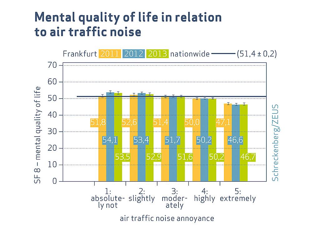 Noise can influence quality of life – both mentally and physically. In order to identify a possible connection between Traffic noise and quality of life, the NORAH team used several scientifically established questions. From the answers of the study participants they then calculated a point score for the mental and for the physical quality of life. They looked at the results over the course of time from 2011 to 2013, but also in comparison with the average value for the whole of Germany.