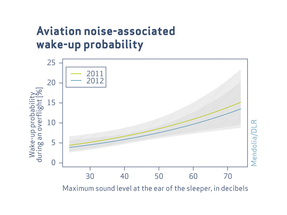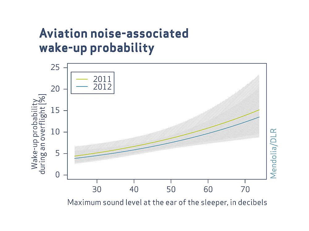 The graph shows the probability of waking up during an overflight with a certain maximum Sound level. The wake-up probabilities for 2011 and 2011 are not significantly different (L Glossary). This is apparent from the strong overlap of the shaded “confidence intervals”.