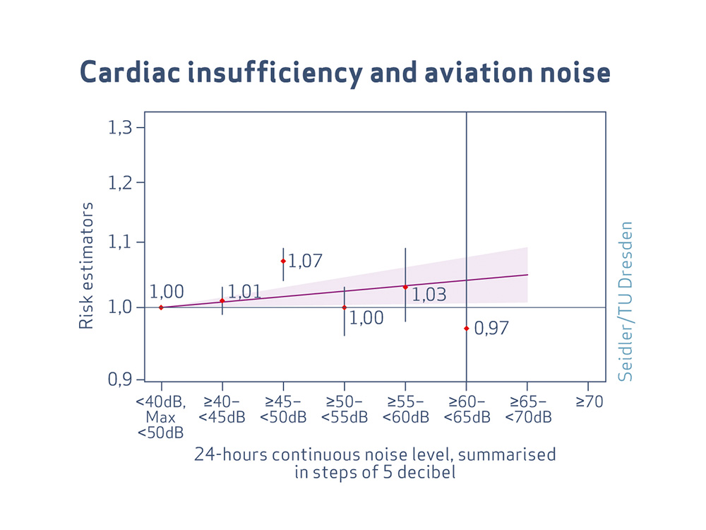 Additionally, the aviation noise results tend to be less certain than the road and railway noise results, since aviation noise levels above 65 decibels did not exist in the area under examination. Additionally, the data suggests that the time of residence plays a role: According to this, the risk of cardiac insufficiency may increase in persons who lived in noisy areas for several years. This assumption is to be covered by further studies.