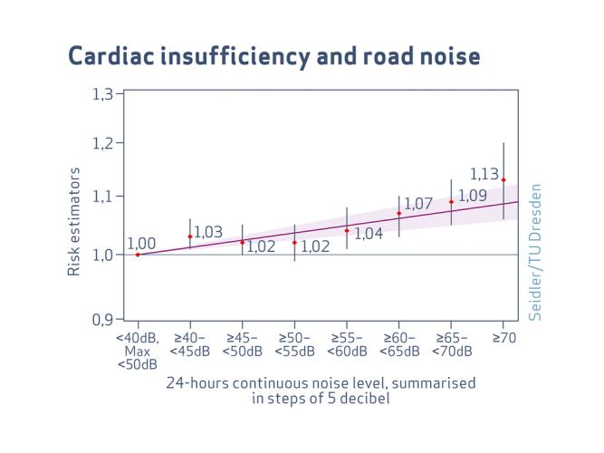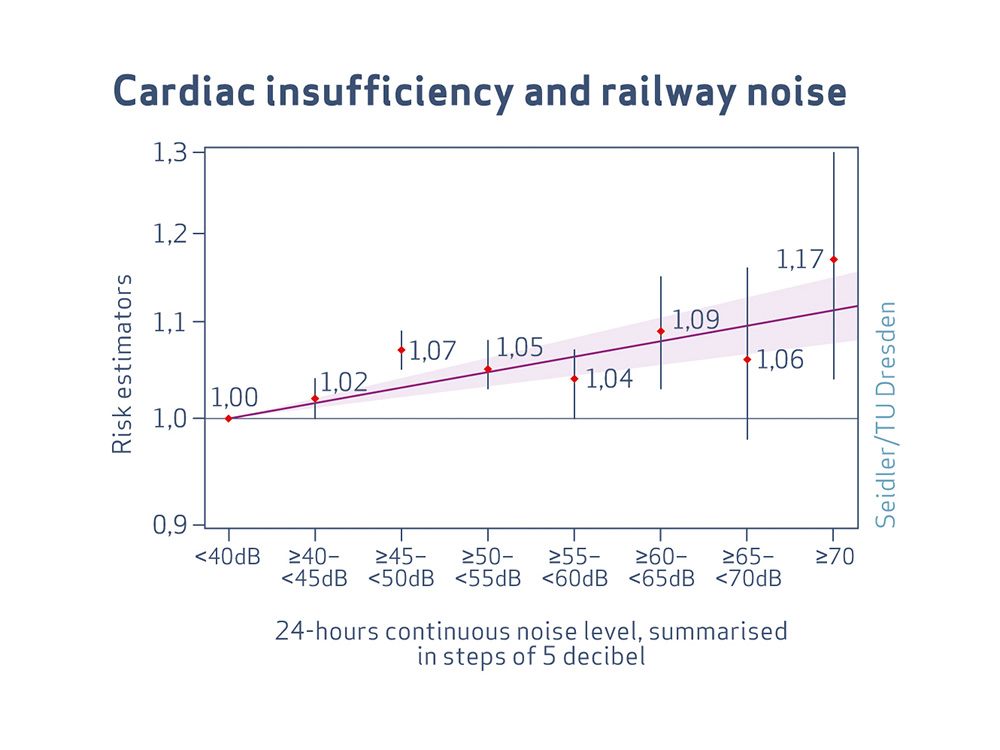 - The connection is the clearest with railway noise: Per ten decibel, the risk of cardiac insufficiency increases by 3.1 percent.