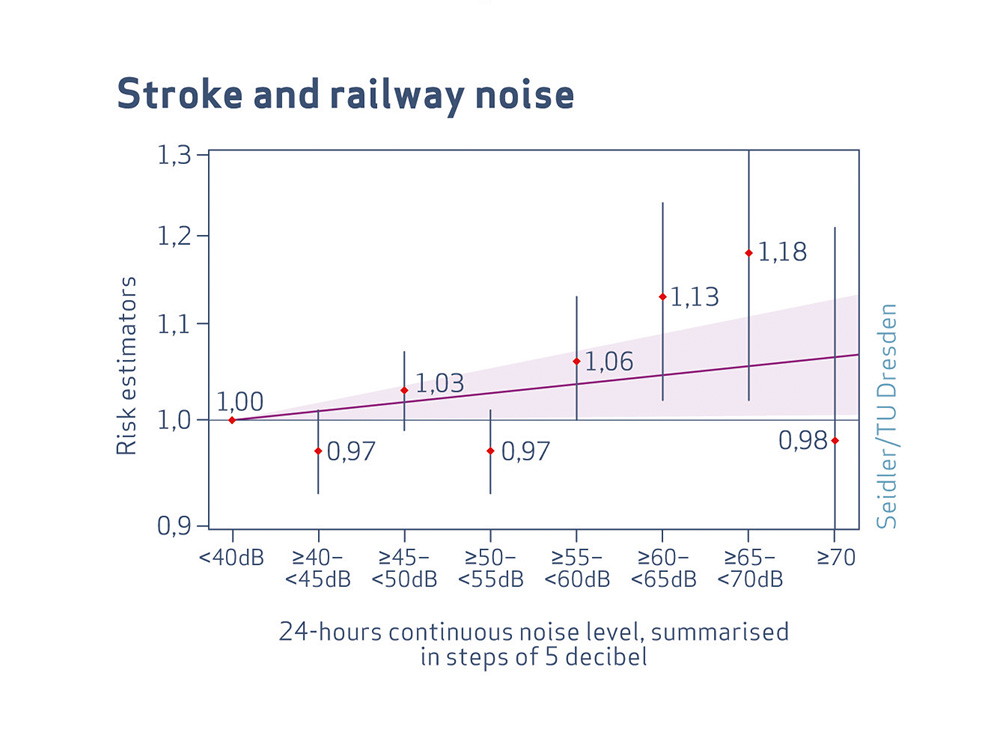 - For railway noise, the stroke risk increases by 1.8 percent per ten decibel.
