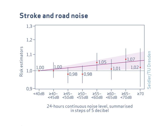 - When the 24-hours continuous noise level of road noise increases by ten Decibel, the risk of stroke increases by 1.7 percent.