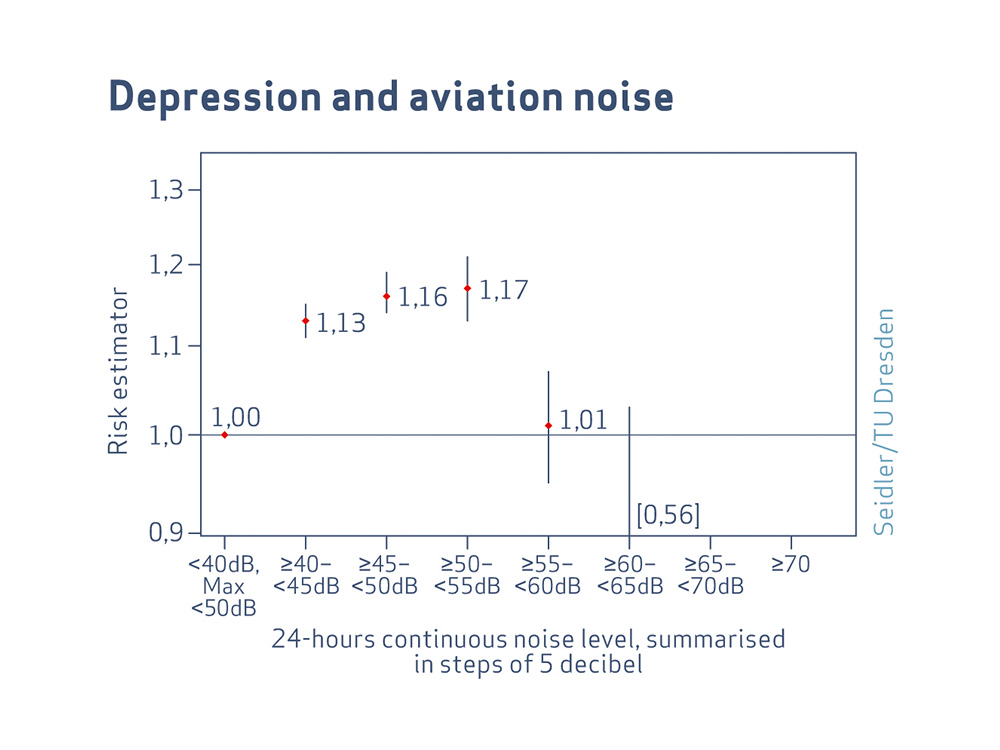 The rather unexpected results of the study included the results for depression at aviation and railway noise: The curve is an inverted U. This means: The risk for depressive disease increases with rising noise level first. In areas with very high aviation or railway noise exposure, however, the static risk drops again. The cause of this unusual distribution as compared to the other results cannot be determined by the NORAH study. One explanation may be that persons suffering under noise very strongly and tending to develop depression will move less often in areas with high aviation or railway noise exposure, or may move away from there more often. Whether this is accurate and why this is different for road noise than for aviation and railway noise must be determined in future studies.