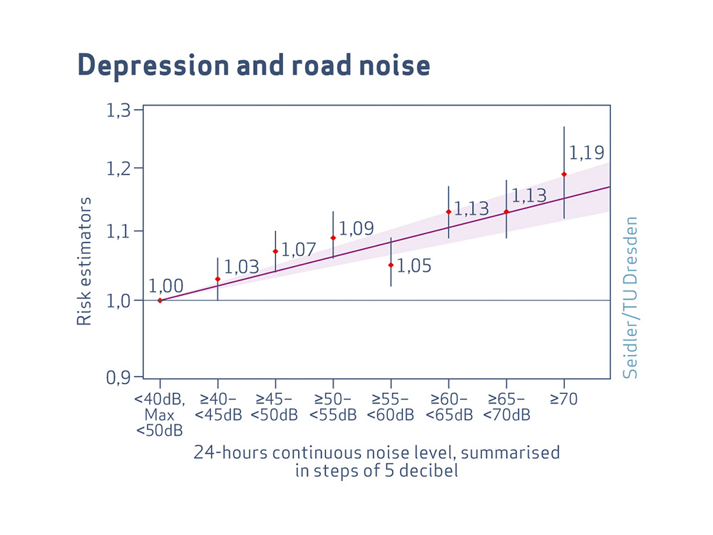 In fact, the scientists were able to find a connection: between traffic noise and the medical diagnosis of a depressive episode with NORAH. Increase of the continuous noise level by ten Decibel increases the depression risk