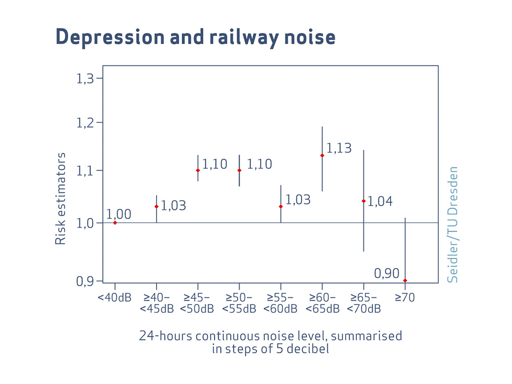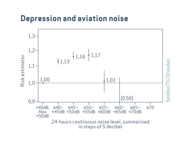- The depression risk increases first with rising noise, but drops again at high noise exposures. This figure shows no linear risk increase, but the average risk estimators in 5-decibel-steps each. The vertical dashes above and below the risk estimators indicate the “confidence interval” in which the actual value will be found with a likelihood of 95 % (also see reading aid on page 5). From this data, an increase of the depression risk of 3.9 % per 10 decibel can be calculated (statistically significant).