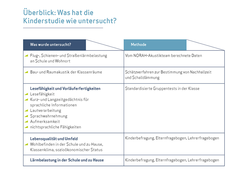 Die Studie konzentriert sich auf das Lesenlernen, das gesundheitliche und schulische Wohlbefinden der Kinder sowie die Lärmbelästigung beim Lernen zu Hause und in der Schule. Damit knüpft sie direkt an frühere Studien an anderen Standorten an und versucht, noch offene Fragen zu beantworten.