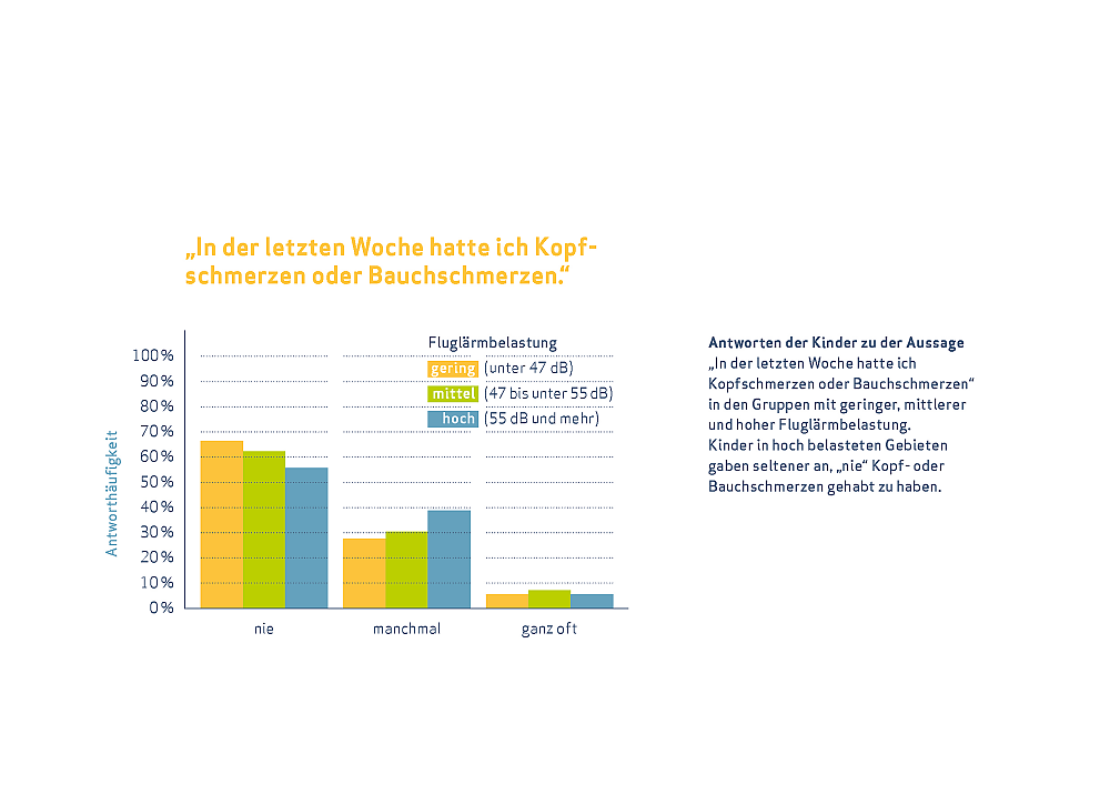 Zur Einschätzung des psychischen Wohlbefindens diente unter anderem die Frage, ob sich die Kinder in der vorhergehenden Woche gelangweilt hätten. Das Ergebnis: Je mehr Fluglärm, desto eher gaben die Kinder an, ihnen sei in der letzten Woche langweilig gewesen. Ein Anstieg des Fluglärms um zehn Dezibel (A) geht mit einer Verschlechterung von etwa 0,14 auf einer dreistufigen Skala einher. Nur rund 40 Prozent der Kinder mit hoher Fluglärmbelastung gaben an, dass ihnen nie langweilig gewesen war – im Vergleich zu 53 Prozent der Kinder in Gebieten mit geringer Fluglärmbelastung.