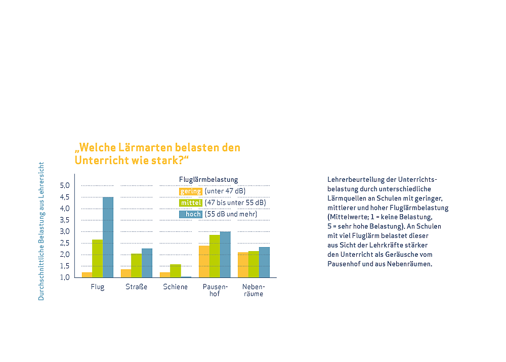 Das Ergebnis: Lehrkräfte nehmen Geräusche vom Pausenhof oder aus den Nebenräumen als Belastungen des Unterrichts wahr. Mit Abstand die stärkste Belastung ist aus Sicht der Lehrkräfte an vergleichsweise hoch fluglärmbelasteten Schulen aber der Fluglärm: Auf der fünfstufigen Skala erreichen ihre Antworten für diese Lärmart den Durchschnittswert 4,5.