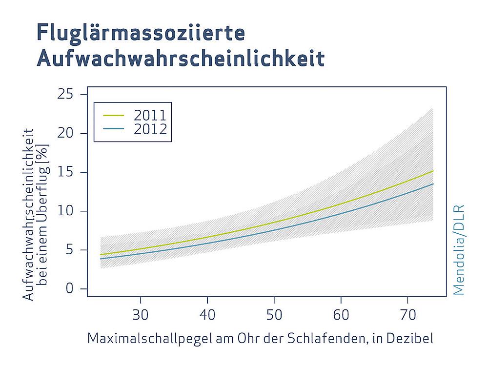Der überwiegende Teil der Überflüge führte nicht zum Aufwachen. Das NORAH-Team wollte genauer wissen, ob manche Überflüge den Schlaf stärker stören als andere. Dazu analysierten sie unter anderem den Maximalschallpegel (Glossar), also die höchste Lautstärke jedes Überflugs, und die Uhrzeit. Sie fanden heraus, dass – wenig überraschend – lautere Überflüge häufiger zum Aufwachen führten. Allerdings spielte auch der Unterschied zwischen den allgemeinen Hintergrundgeräuschen und dem Maximalschallpegel des Überflugs eine Rolle: Waren die Hintergrundgeräusche lauter und der Unterschied zum Überfluglärm deshalb geringer, wachten die Teilnehmerinnen und Teilnehmer seltener auf. Und auch die Uhrzeit spielt eine Rolle: Gegen Ende der Nacht, wenn der Schlafdruck nachließ, wachten die Teilnehmerinnen und Teilnehmer leichter auf als zu Beginn der Nacht.