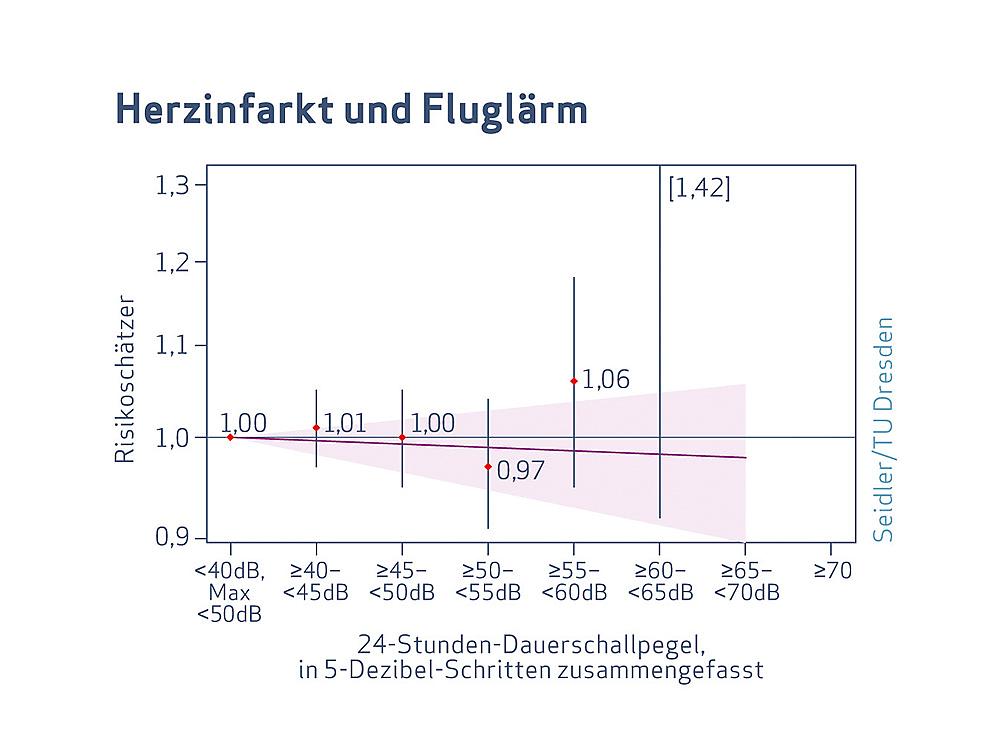 - Beim Fluglärm findet sich kein statistisch signifikanter Zusammenhang zwischen dem gleichmäßigen Lärmzuwachs und einem Herzinfarkt. Allerdings waren weniger Menschen im Untersuchungsgebiet lautem Fluglärm ausgesetzt: Nur bei etwa zwei Prozent der Personen im Untersuchungsgebiet lag der Fluglärm-Dauerschallpegel über 55 Dezibel, bei niemandem überstieg er 65 Dezibel. Zum Vergleich: Der Straßenlärmpegel lag bei 26 Prozent der Versicherten über 55 Dezibel, der Schienenlärm bei sieben Prozent der Personen. Daher ist es beim Fluglärm schwieriger, den Risikoverlauf abzubilden.