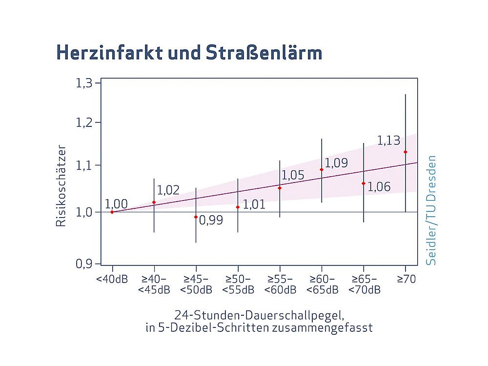 - Wenn der 24-Stunden-Dauerschallpegel des Straßenlärms um zehn Dezibel zunimmt, erhöht sich das Risiko, einen Herzinfarkt zu erleiden, um 2,8 Prozent.