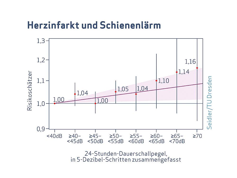 - Pro zehn Dezibel Schienenlärm-Dauerschallpegel erhöht sich das Herzinfarktrisiko um 2,3 Prozent.